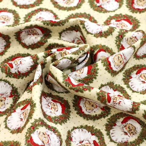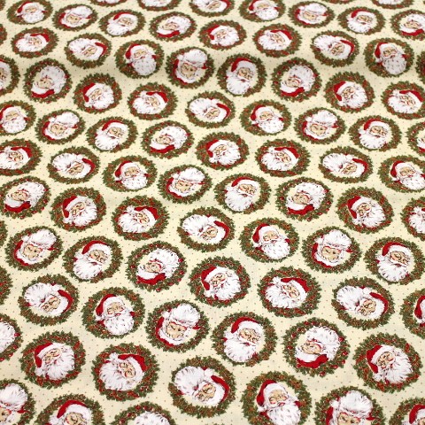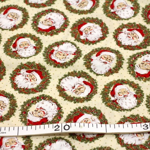 クリスマス生地 サンタ リアルなサンタ リース ゴールド 生成色 薄いクリーム色 ku-c-AL シーチング生地 綿100% 110㎝幅 クリスマスの小物に使えます。 ランチョンマットやテーブルクロスに使うだけで、クリスマス感、満載です。 小物やスカートなどクリスマスグッズに適しています。 2mまでは小口便可です。 表示価格は10㎝です。 生地やひもテープなどはすべて10㎝から10㎝単位でお切りします。 10㎝は数量「1」と入力、1mは数量「10」と入力してください。