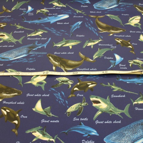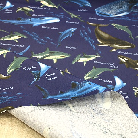 ラミネート生地 海の生き物 魚 海の魚 海 生き物 サメ クジラ 濃い青 青色 R-341 つやなし 素材 綿100%のオックス生地にラミネート加工された布です。 つや消しラミネートです。 布サイズ 107㎝幅 雨や水を弾いてくれる布です。 カバンやランチョンマットなど小物作り使えます。 男の子に人気の魚だらけの生地です 入園入学のカバンやリュックにピッタリです(^ ^) 柄が大きいので、カットの場所によって柄が多少変わります。 折りたたみ可の場合は、 50㎝までは小口便可です。 表示価格は10㎝です。 生地やひもテープなどはすべて10㎝から10㎝単位でお切りします。 10㎝は数量「1」と入力、1mは数量「10」と入力してください。