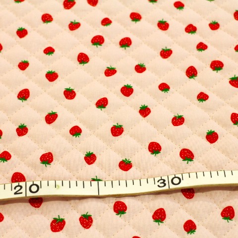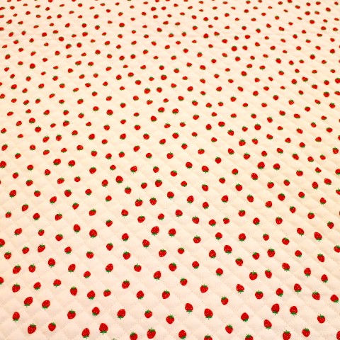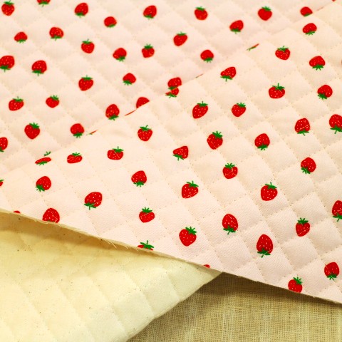 キルティング生地 いちご柄 イチゴ いちご いちごがいっぱい ピンク色×赤色いちご Q-345 いちごがたくさんのシンプルな柄です。 可愛いイチゴ柄が好きな子におススメの柄です。 レッスンバッグ、トートバッグ、ズック袋、お布団袋など。 入園入学にピッタリです(^ ^) 素材 (表、裏布)綿100% (中綿)ポリエステル100% 布幅 105㎝幅 50㎝までは小口便可です。 全針キルトです。 柄が大きいので、カットの場所によって柄が多少変わります。 表示価格は10㎝です。 生地やひもテープなどはすべて10㎝から10㎝単位でお切りします。 10㎝は数量「1」と入力、1mは数量「10」と入力してください。