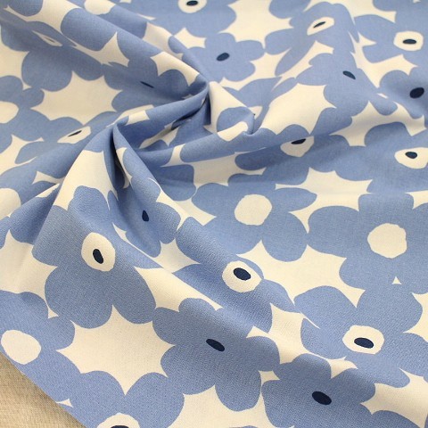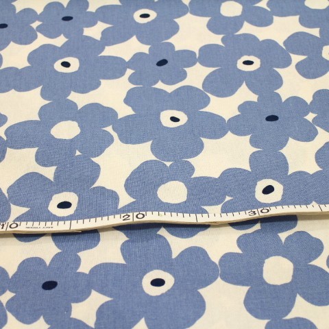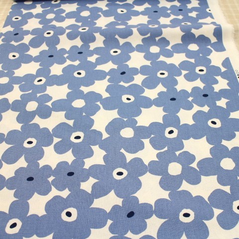 綿麻 綿麻生地 マリメッコ調柄 北欧風 北欧調 フラワー シンプル 大きい花柄 花柄 白色×グレーみの明るい青色 L22-35 北欧風の花柄です。 カバンや小物に使える布です♪ 綿 80% 麻 20% 110㎝幅 綿麻の布は洗うと縮みやすいので、使用前に水通しをしての、ご利用をお勧めします。 2mまでは小口便可です。 表示価格は10㎝です。 生地やひもテープなどはすべて10㎝から10㎝単位でお切りします。 10㎝は数量「1」と入力、1mは数量「10」と入力してください。