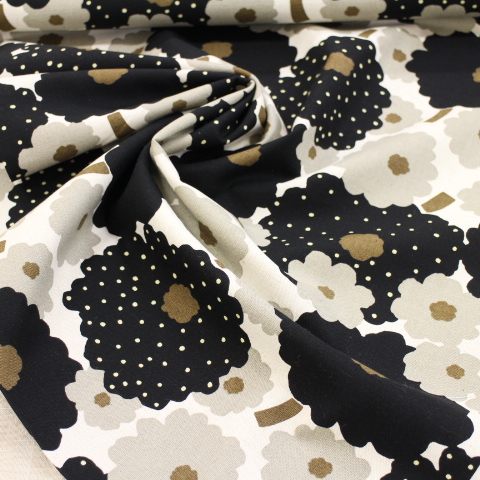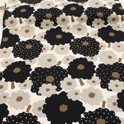 綿麻 綿麻生地 マリメッコ調柄 北欧風 北欧調 フラワー シンプル ドット 水玉 大きい花柄 花柄 黒×グレーみのベージュ L22-37 北欧風の花柄です。 カバンや小物に使える布です♪ 綿 80% 麻 20% 110㎝幅 綿麻の布は洗うと縮みやすいので、使用前に水通しをしての、ご利用をお勧めします。 2mまでは小口便可です。 表示価格は10㎝です。 生地やひもテープなどはすべて10㎝から10㎝単位でお切りします。 10㎝は数量「1」と入力、1mは数量「10」と入力してください。